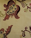 サンダーソン社のヴィンテージデザインRoslynは1910年にデザイナーウイリアム ターナーにより生み出された壁紙が始まりでした。長年にわたり人気を博したこのデザインに、贅沢なまでの色使いで刺繍を施した当生地は、まるでジャコビアン様式を思わせるまでのクラシックな作品に仕上がっています。一枚のカットクロスの大きさ:生地巾143cmx1M素材:綿79% レイヨン21% (刺繍部分)柄の大きさ80cm